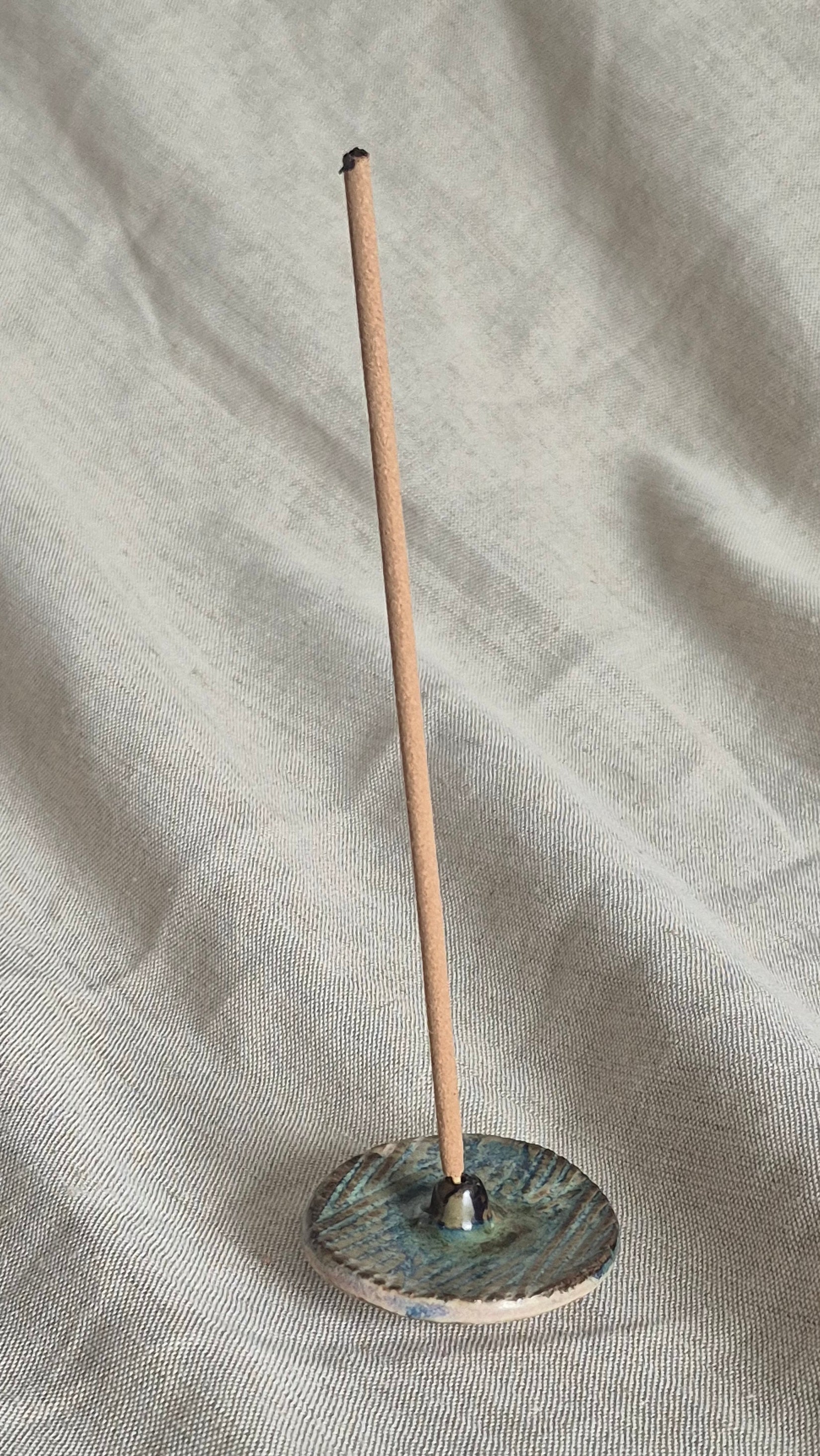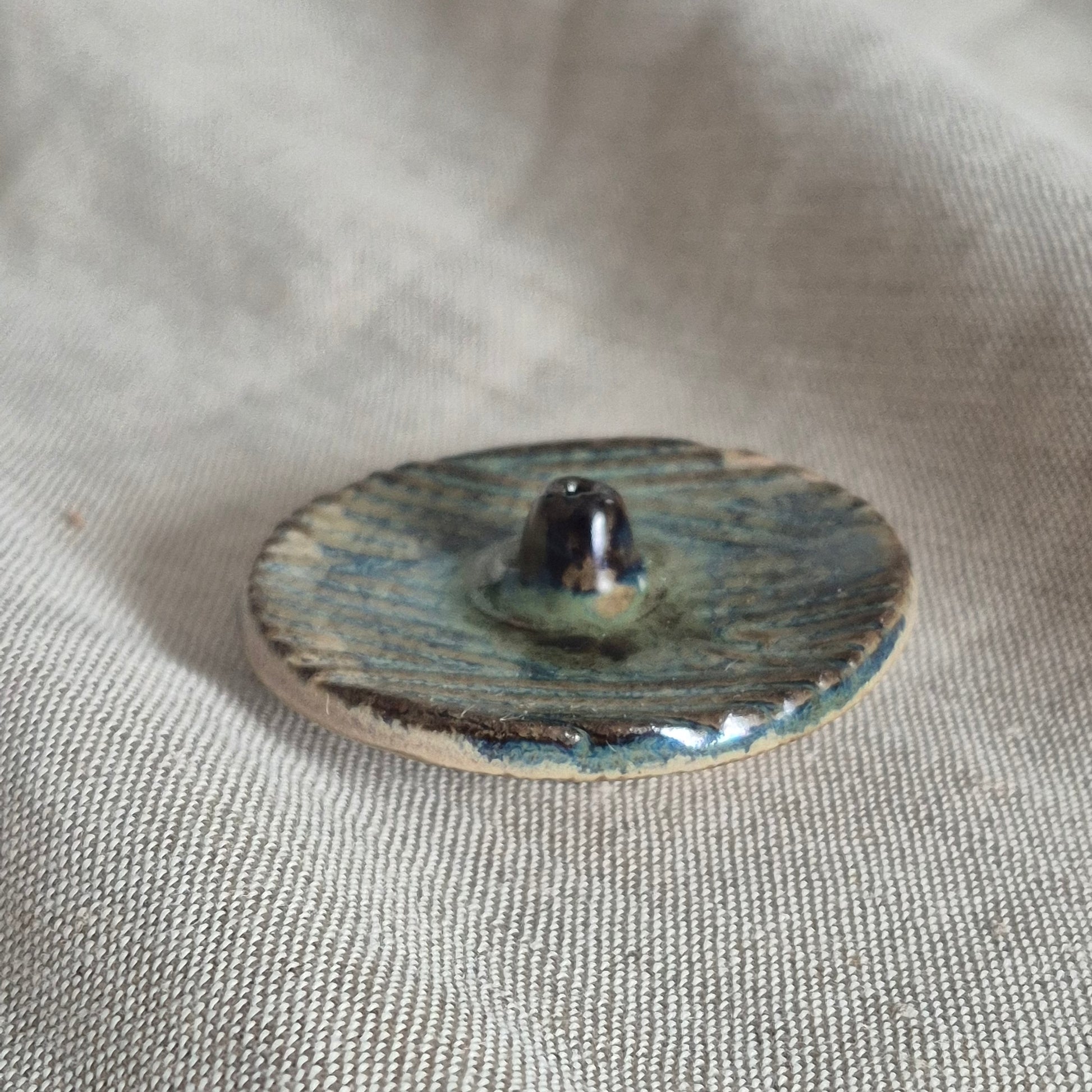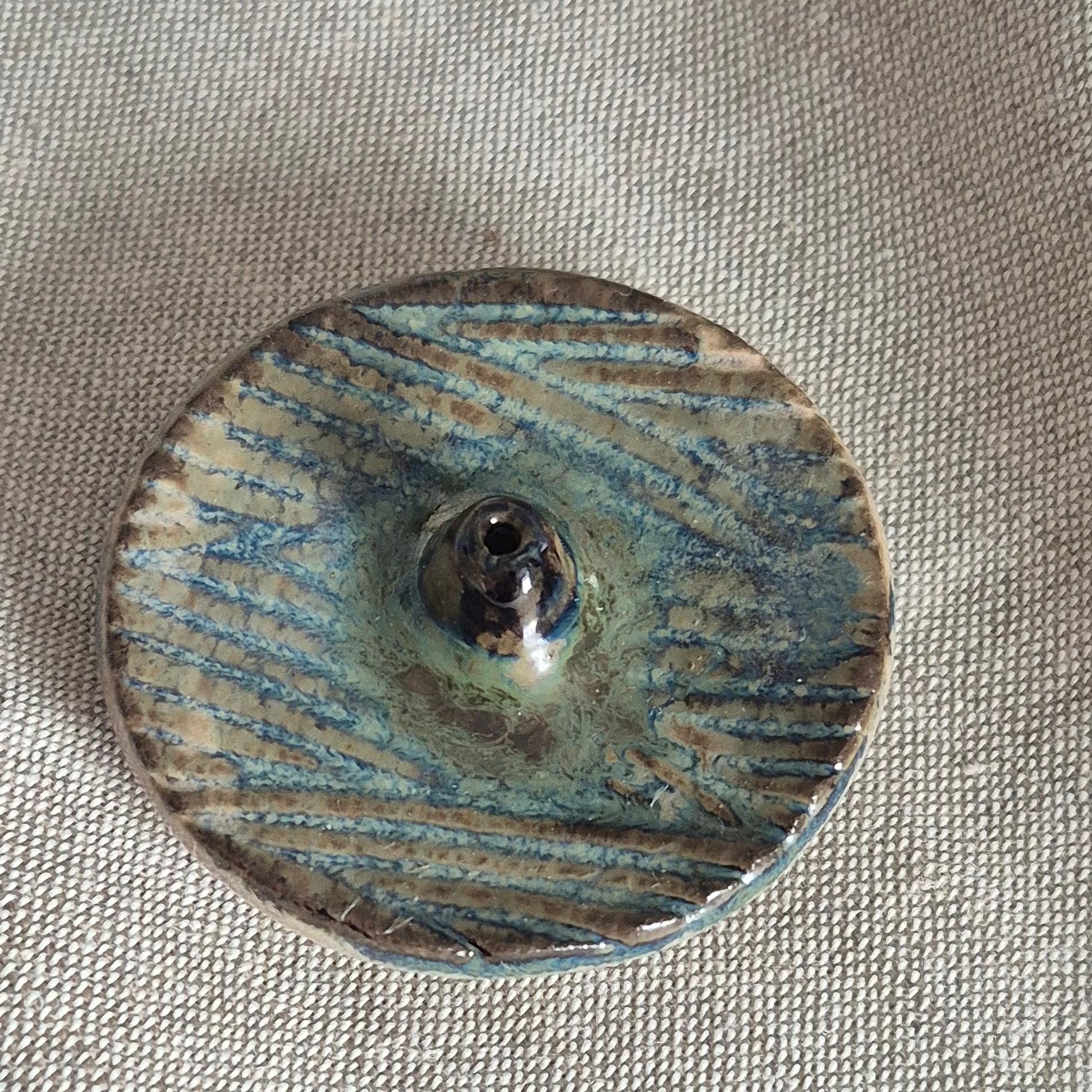 Incense stick holder glazed in a swirl of blue and lavender with a metallic center, and lavender base.