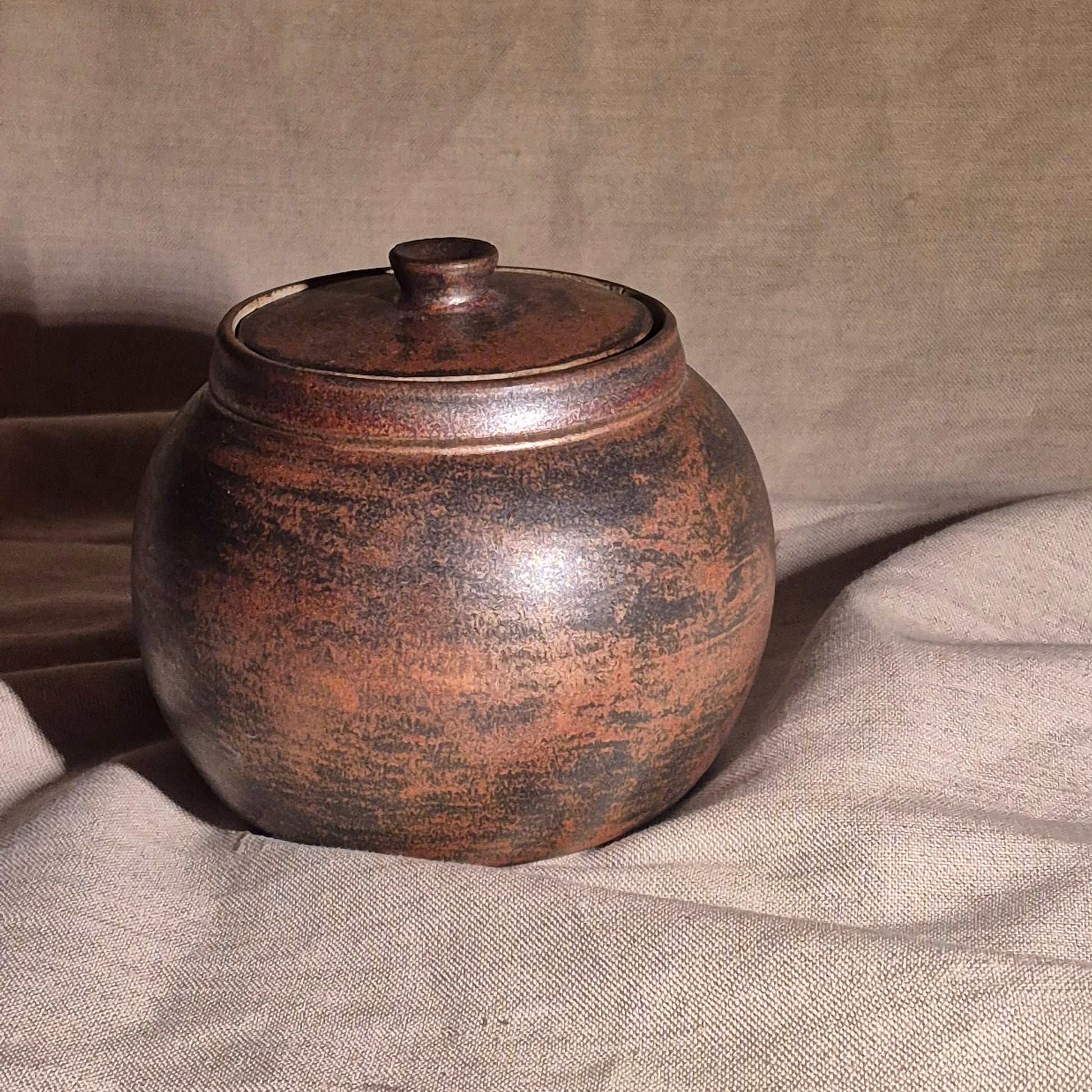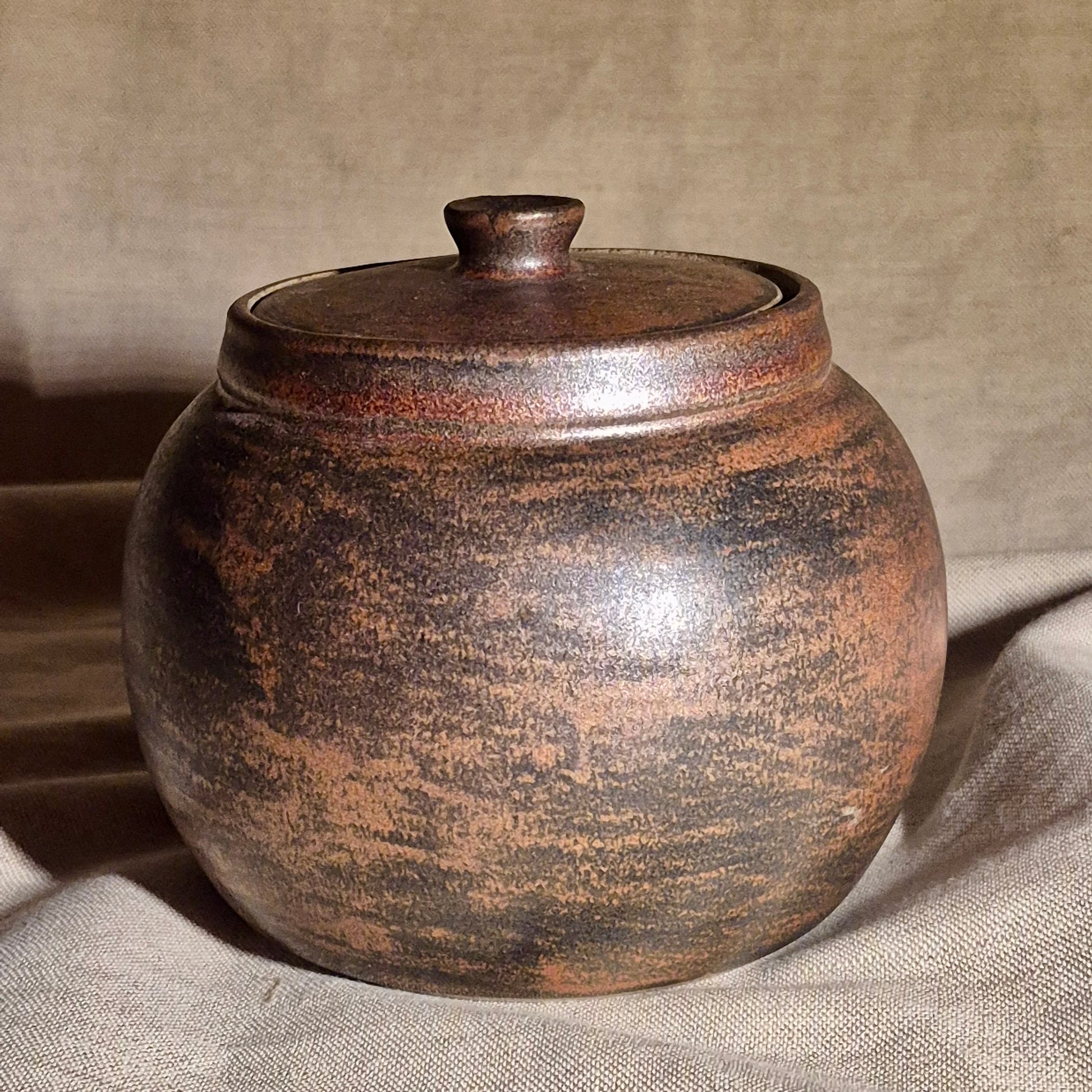 This ceramic jar has a compact, rounded form with softly curved sides and a snug flat lid topped by small knob. The surface is finished in a dark, earthly copper with a mottled metallic appearance. Fine variations in colour and texture give the piece a sense of depth.